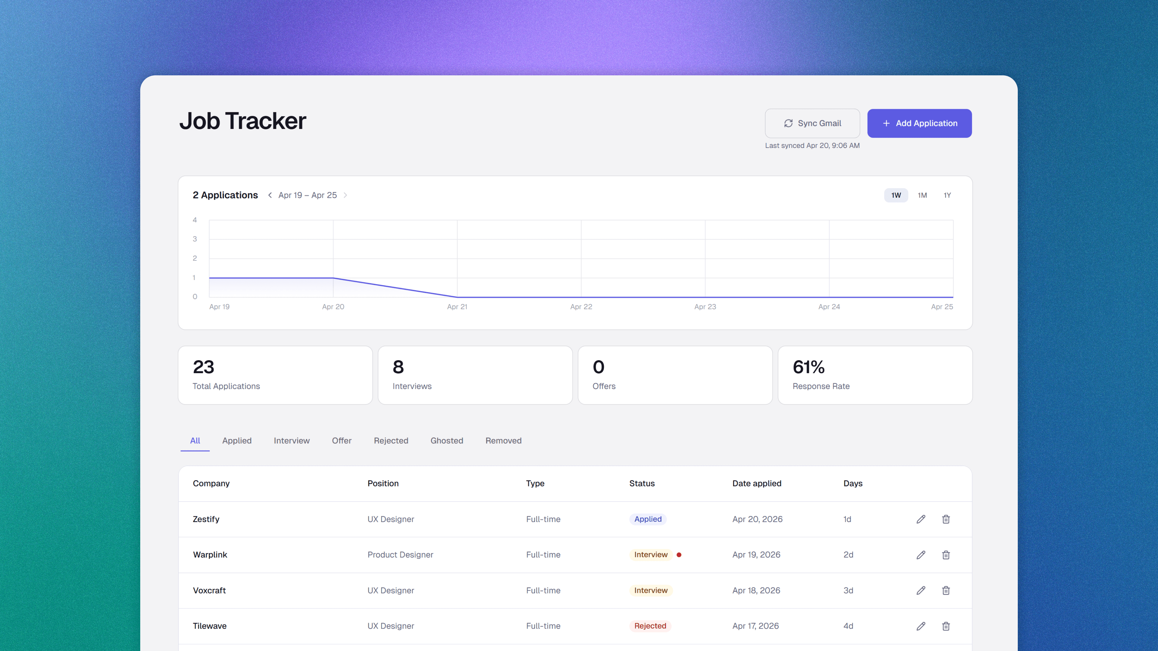 Job Tracker is a responsive web app built to remove the manual work from tracking job applications. AI reads through job descriptions to automatically fill in application details, and syncs recruiter emails to keep statuses up to date.