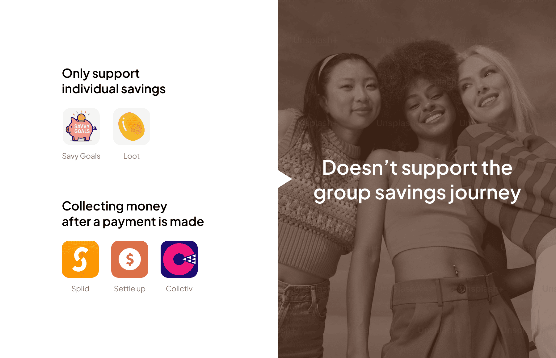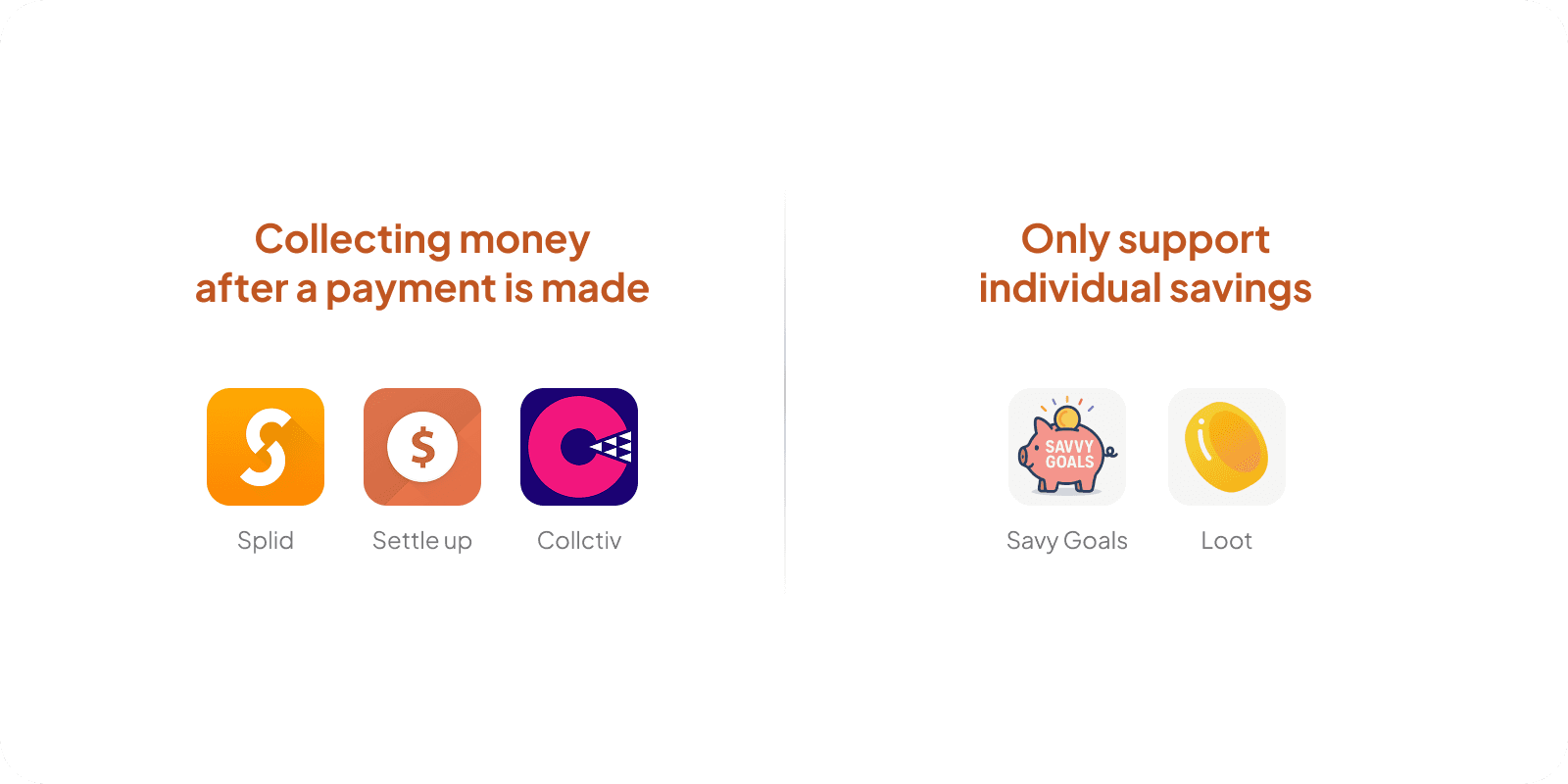 Most apps focus on collecting money after a payment is made instead of supporting ongoing group savings experiences, or are designed only for individual savings.