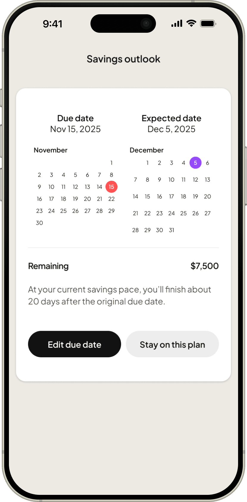 Sometimes users need more time than the original due date to complete their savings. The Savings Outlook feature estimates a user’s completion date based on their savings history and helps extend the due date in advance. This helps the group stay prepared and prevents last-minute changes to the savings plan.